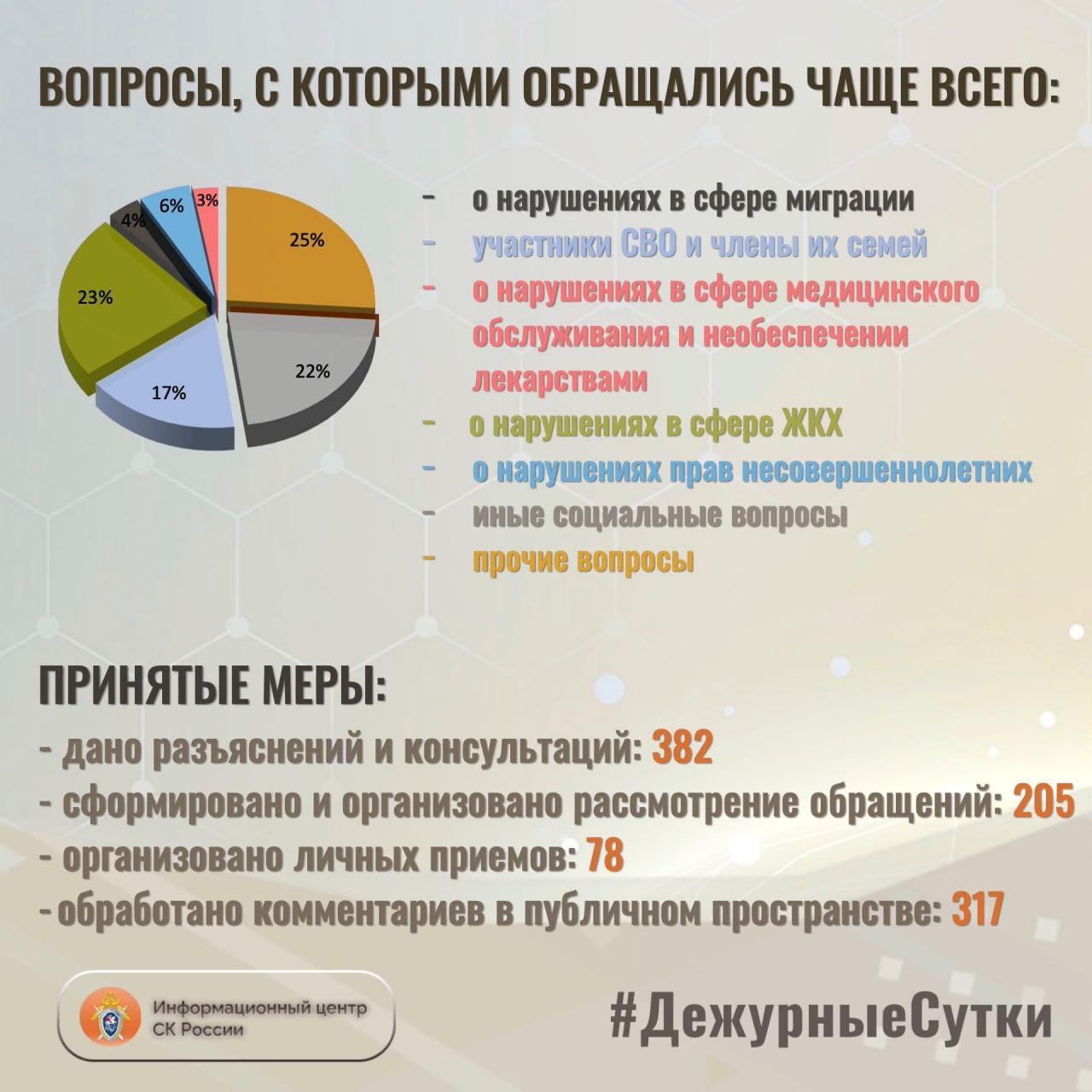 В Информационный центр СК России за прошедшие сутки всего обратилось граждан: 587