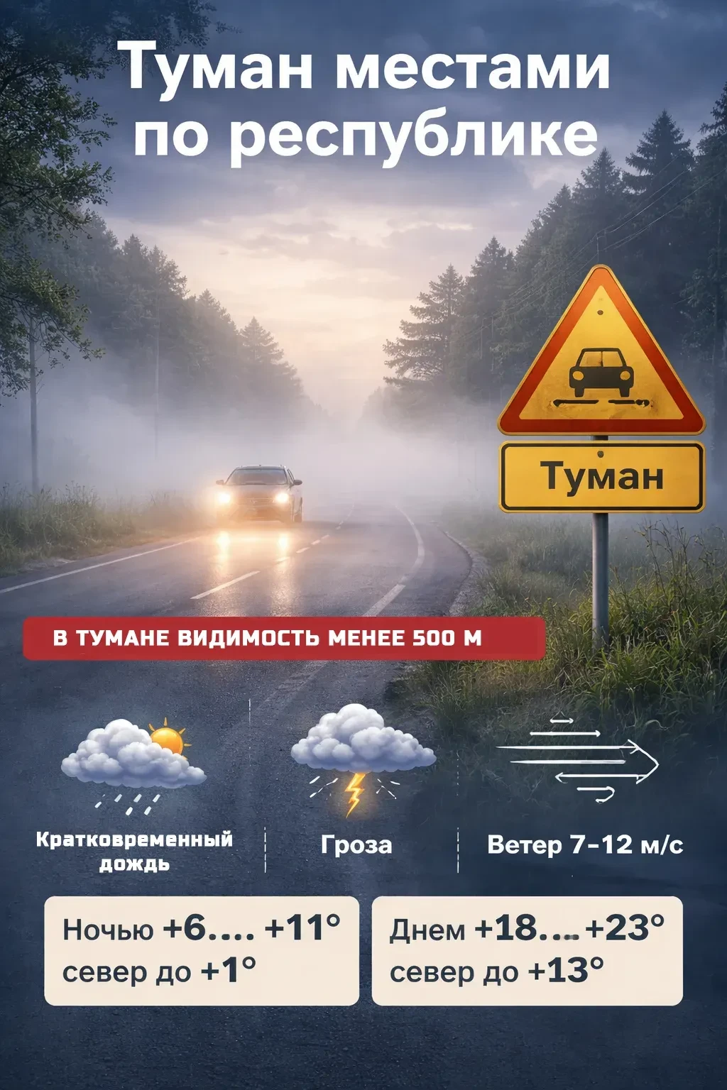 Местами по республике прогнозируется туман, ночью и утром на отдельных участках дорог ухудшение видимости в тумане 500 м и менее