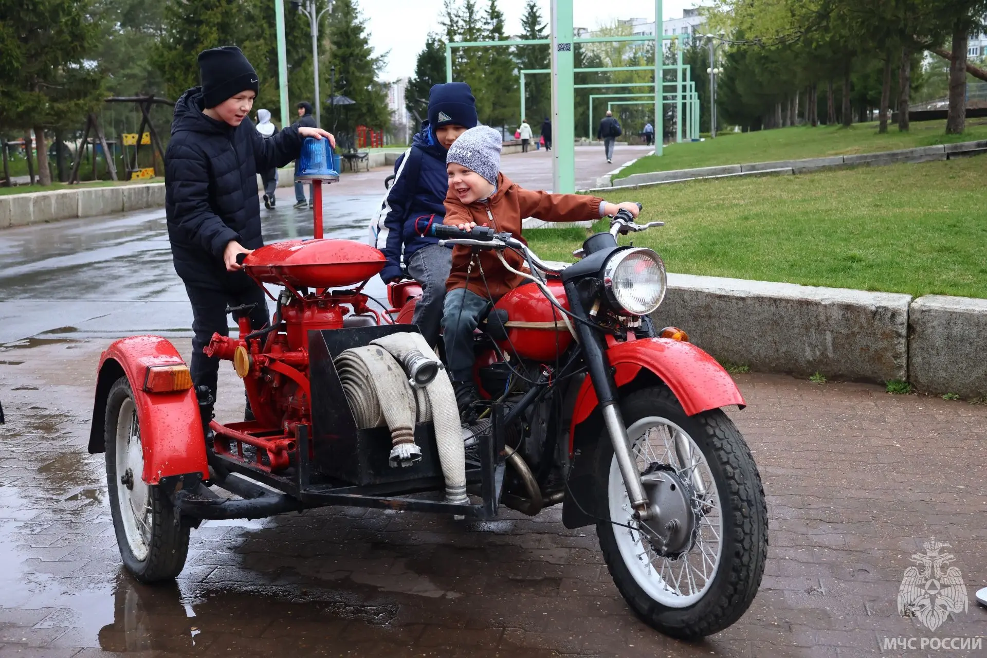 А еще были современные квадроциклы, пожарные автоцистерны, спецмашина, позволяющая при помощи выдвигающейся лестницы подниматься на высотные этажи, транспортер, предназначенный для работы в условиях паводка, а также другие высокотехнологичные машины, предназначенные для тушения и проведения аварийно-спасательных работ.