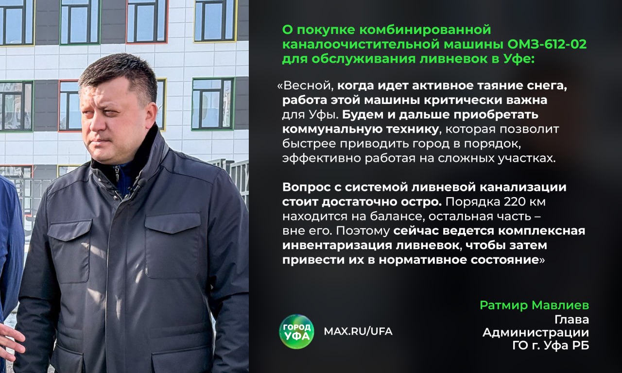 Мэр Уфы заявил, что весной из-за таяния снега такая машина критически важна для города и сообщил о планах дальнейшей покупки коммунальной техники, позволяющей быстрее приводить город в порядок, эффективно работая на сложных участках. Ратмир Мавлиев также отметил, что на балансе находится порядка 220 км ливневок и сейчас ведется комплексная инвентаризация