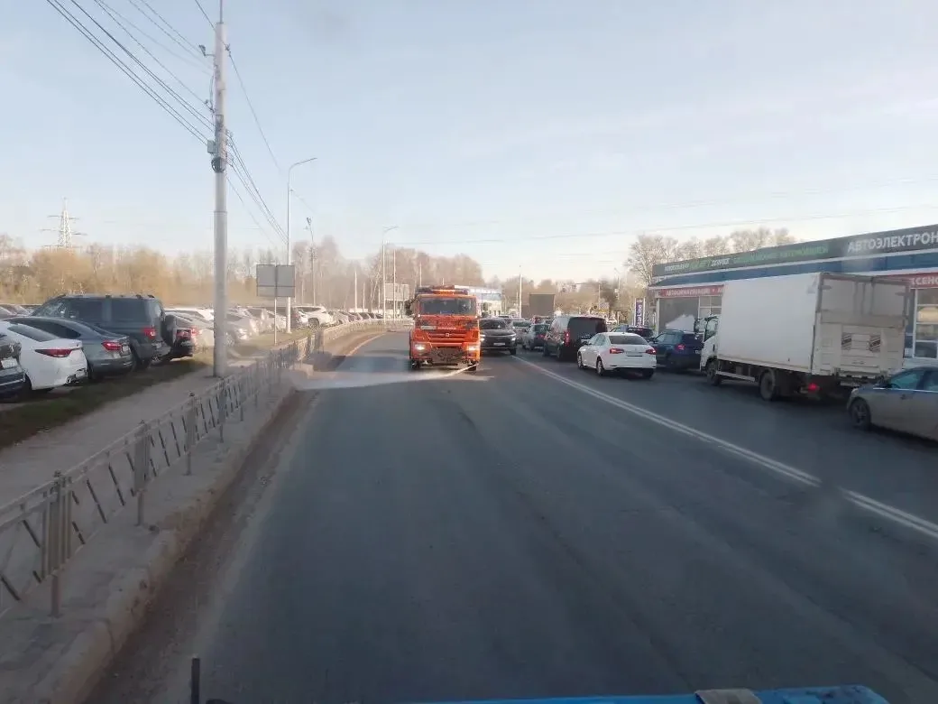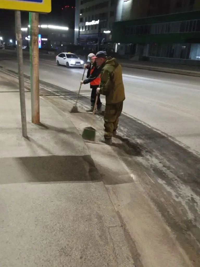 Сегодняшний день не исключение. Рабочие убирают мусор, моют технические полосы и остановки общественного транспорта, а также очищают территории дорог и прилегающих территорий от пыли