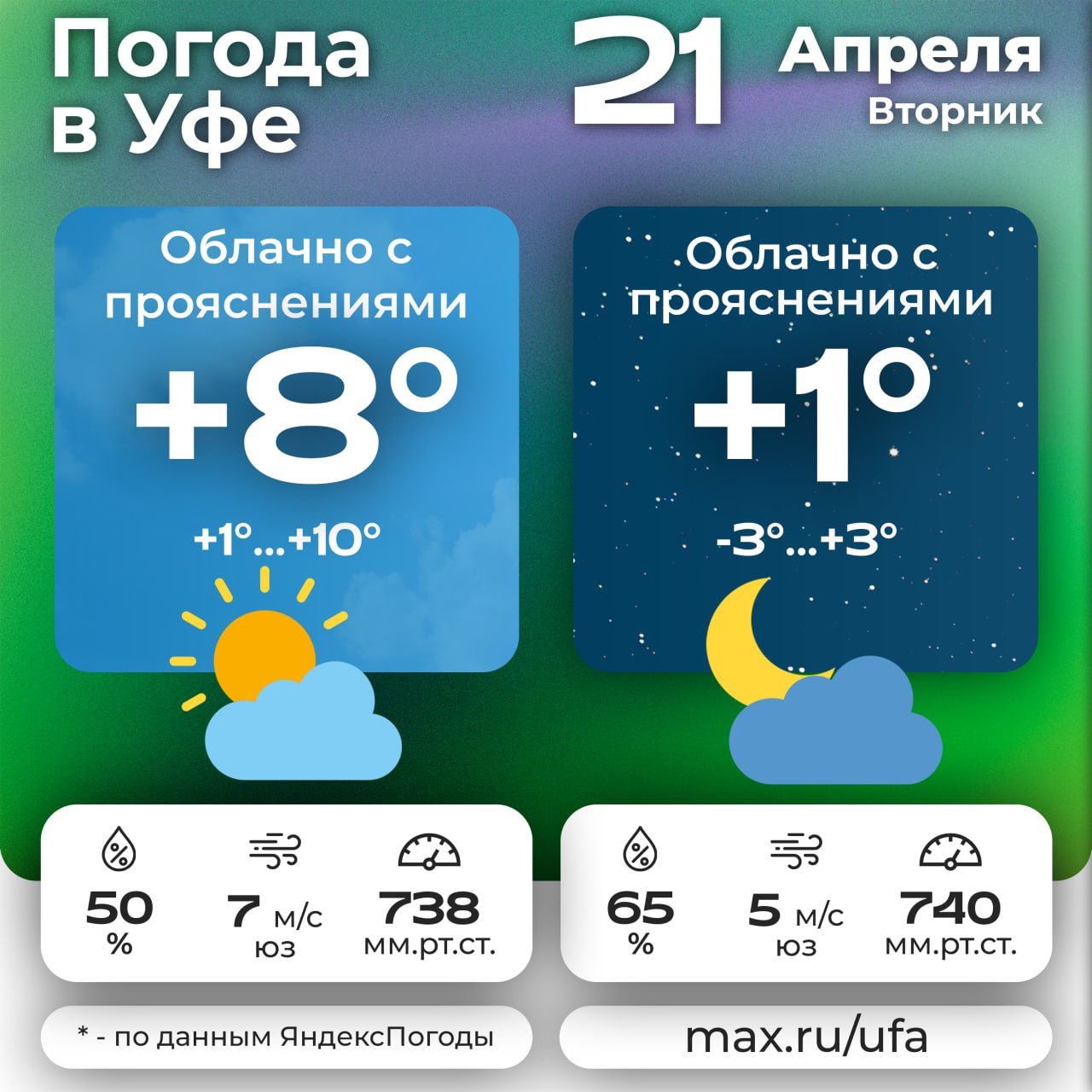 Кратковременные дожди.Ветер юго-восточный с переходом на юго-западный 7-12 м/с, днем местами порывы до 17 м/с.Температура воздуха ночью +3,+8°, днем +8,+13°.На отдельных участках дорог ночью и утром туман, видимость 500-1000 м.В Уфе облачная погода....