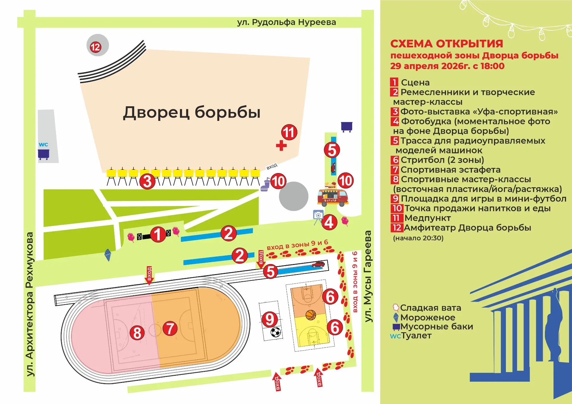 Дворец борьбы приглашает жителей и гостей Уфы на яркое открытие новой пешеходной зоны — современного общественного пространства для отдыха, спорта и семейного досуга.