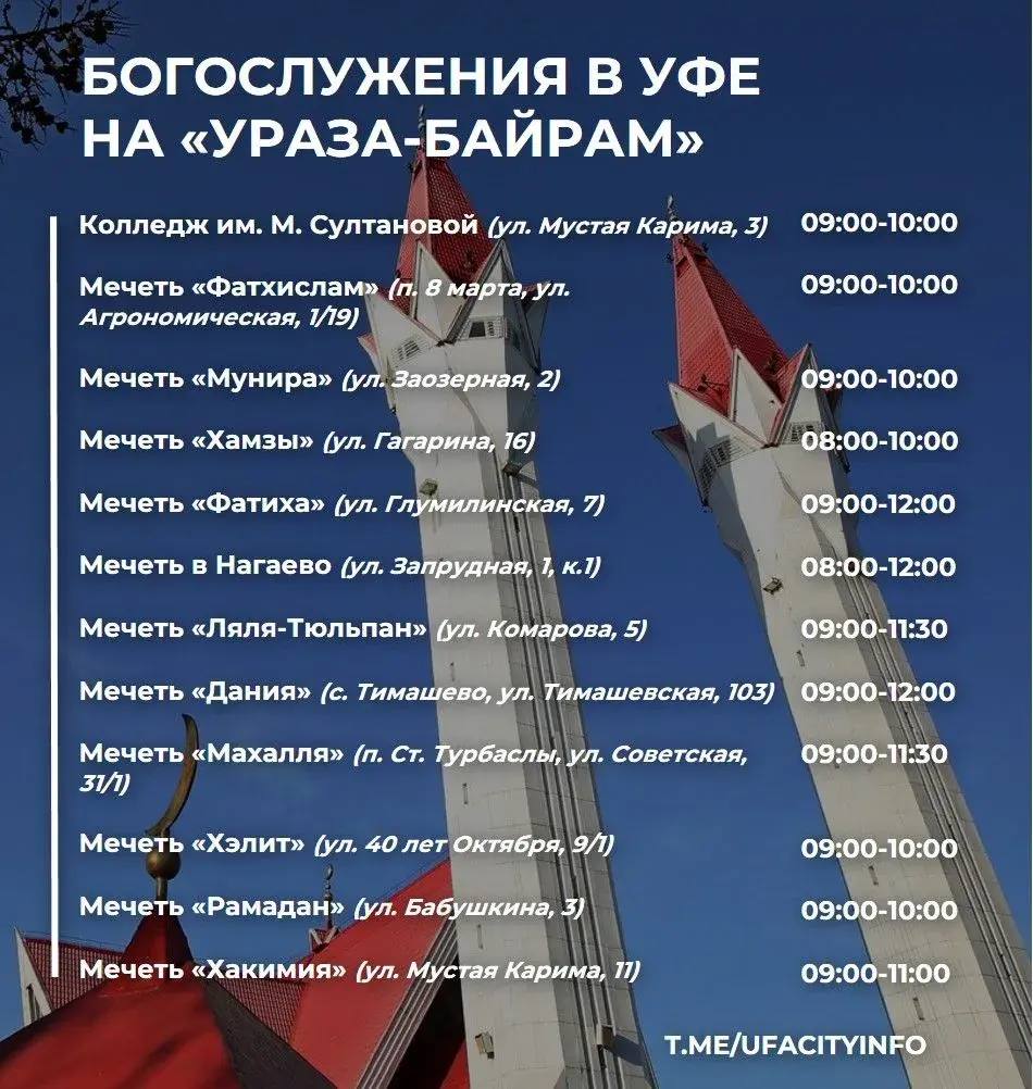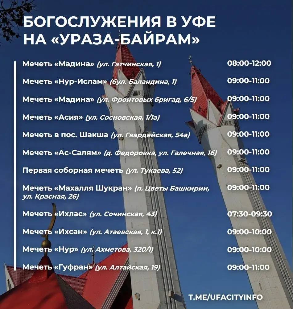 Праздничные богослужения пройдут в 24 мечетях Уфы. С 11:00 до 16:00 перед «Ляля-Тюльпан» – концерт, халяль-ярмарка, детская анимация и угощение пловом.