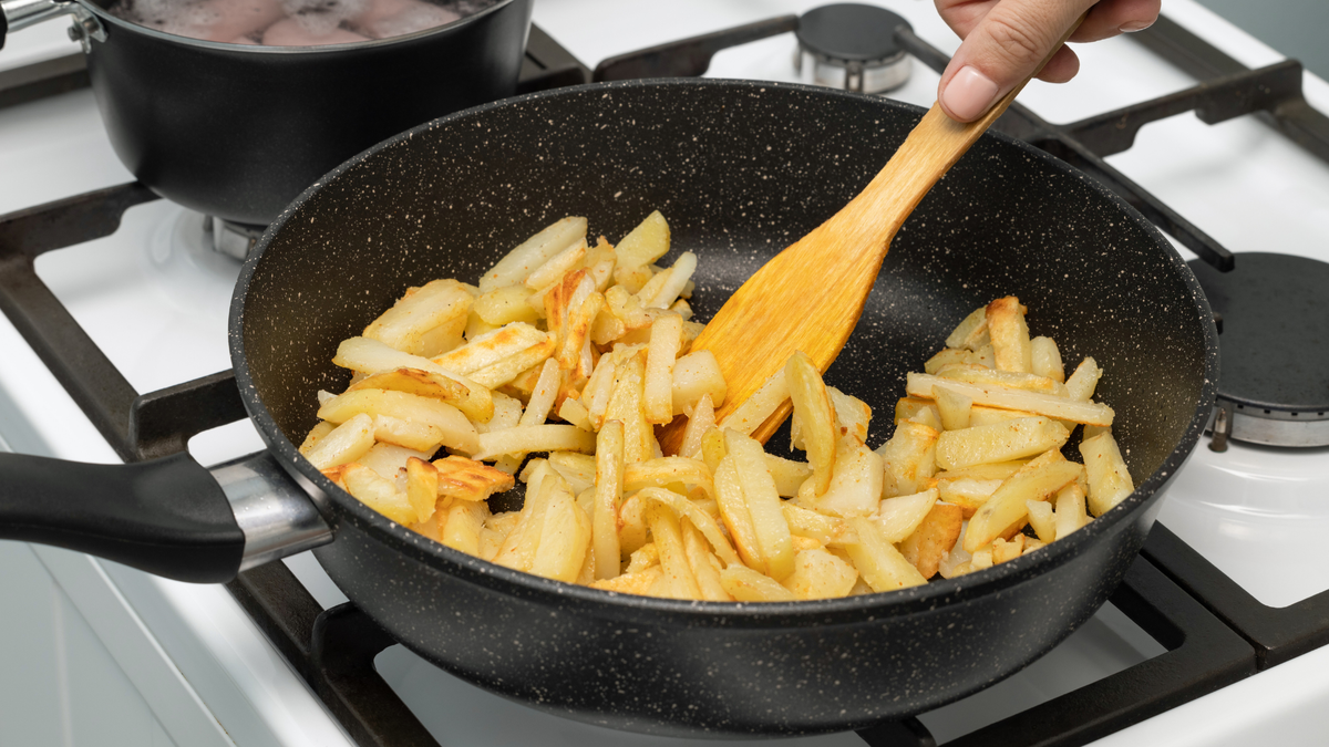 Успех блюда во многом зависит от правильного выбора картофеля. Предпочтение стоит отдавать красным сорта, у них содержание крахмала выше, чем у белых. В супермаркетах часто можно найти специальные маркировки — "картофель для жарки"; обращайте на это внимание!