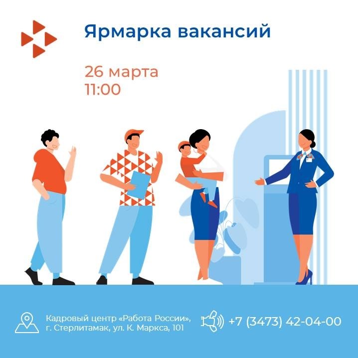 26 марта в Кадровом центре "Работа России" по городу Стерлитамаку пройдёт ярмарка вакансий. Мероприятие соответствует целям национального проекта "Кадры".