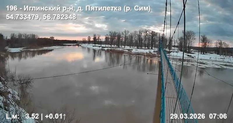 на реке Сим у деревни Пятилетка Иглинского района +95 см, текущий уровень 344 см, выход реки на пойму 616 см.