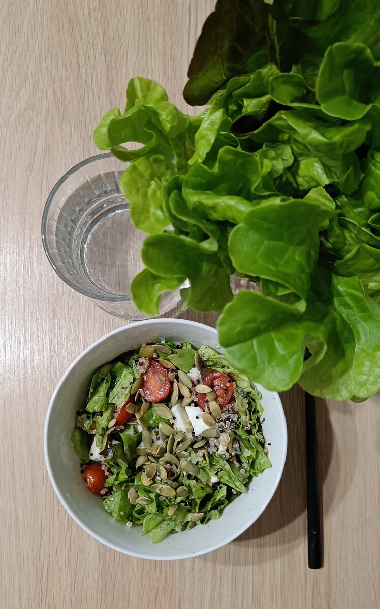 Приготовление салата не займёт много времени: нарезать листья салата и помидоры, добавить отваренную киноа, заправить оливковым маслом и лимонным соком, посолить и поперчить. Завершите блюдо посыпкой тыквенными семечками.