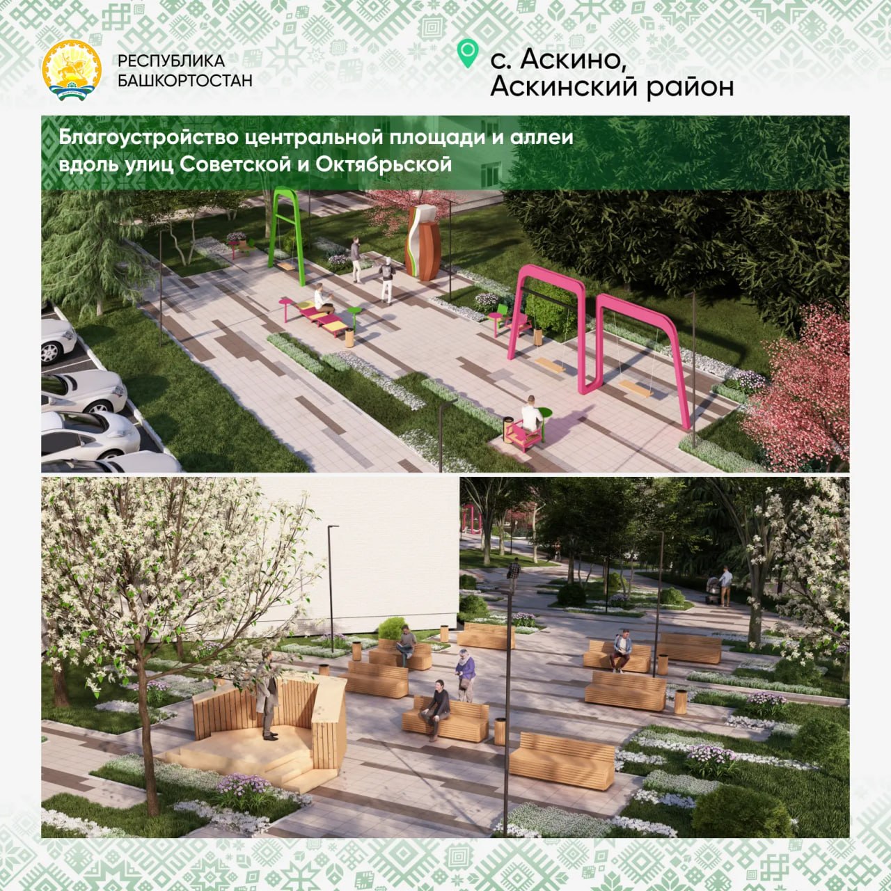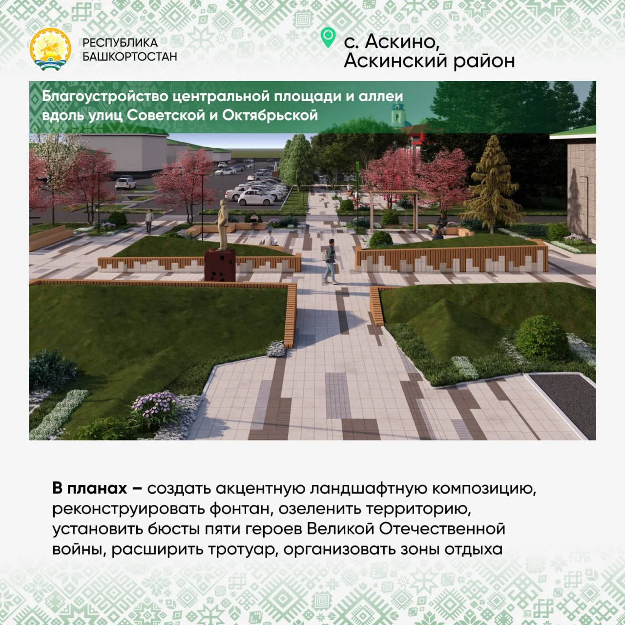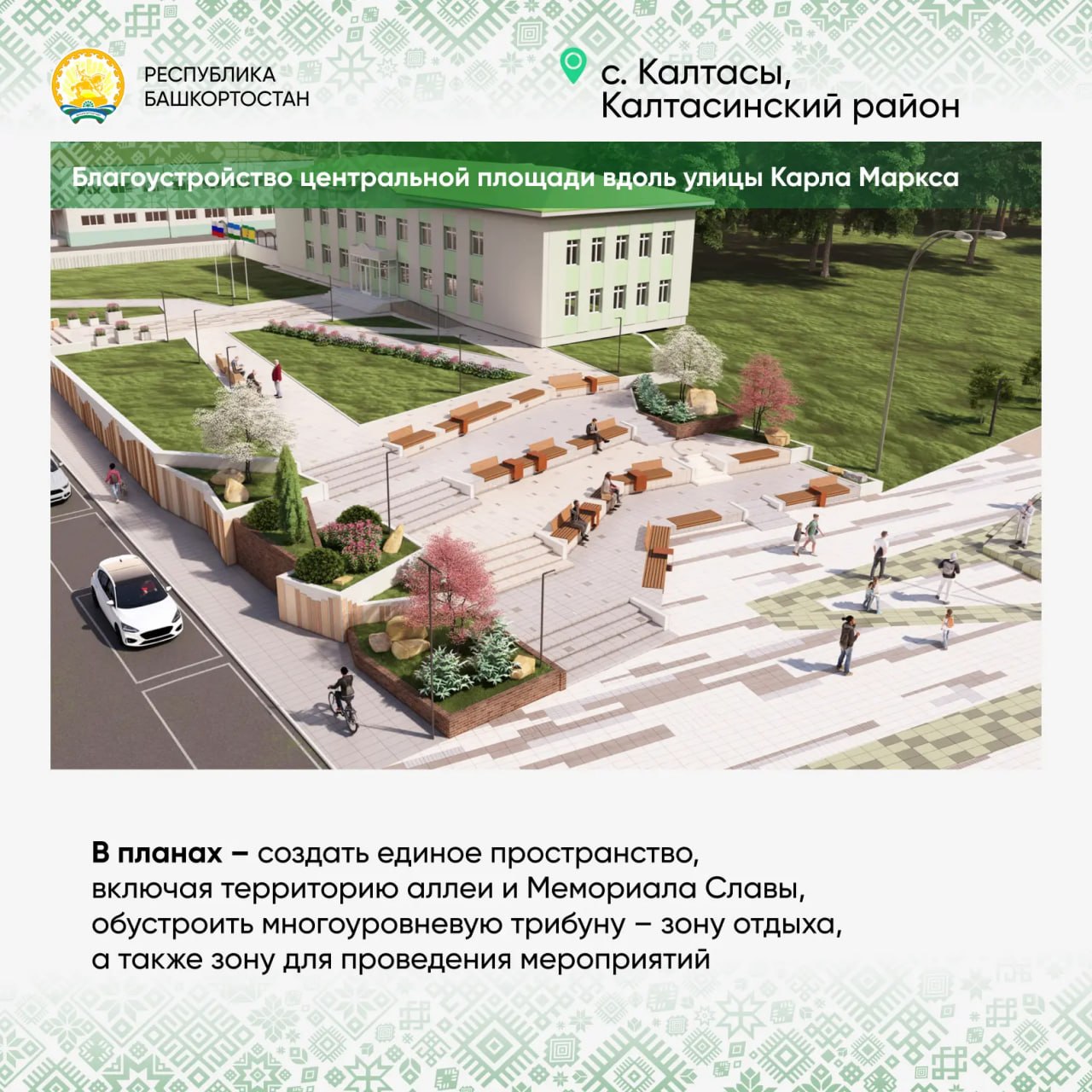 Как и в Ермекеево, в Калтасах будем объединять разные общественные пространства в единое целое – благоустроим не только площадь, но и прилегающие к ней аллею и Мемориал Памяти. Это позволит сделать территорию более функциональной.