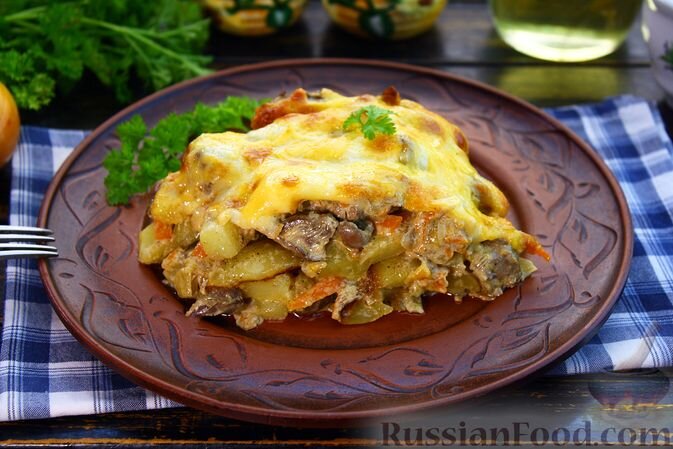 Сначала печень тушится с овощами в сметане, а затем всё выкладывается слоями, покрывается сыром и запекается до золотистой корочки.
