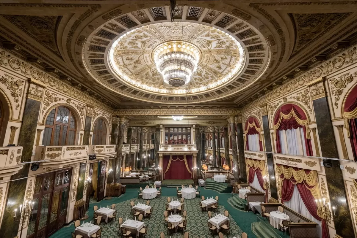Переход к новой эпохе не разрушил эхо прошлого: внутри появляется модерн с арками и куполами, а за фасадом — целый двор, где гости могли наблюдать за происходящим сверху и наслаждаться концертной сценой, на которую поднимались певцы и артисты балета. Но идейная основа осталась прежней: встреча культуры и гастрономии.