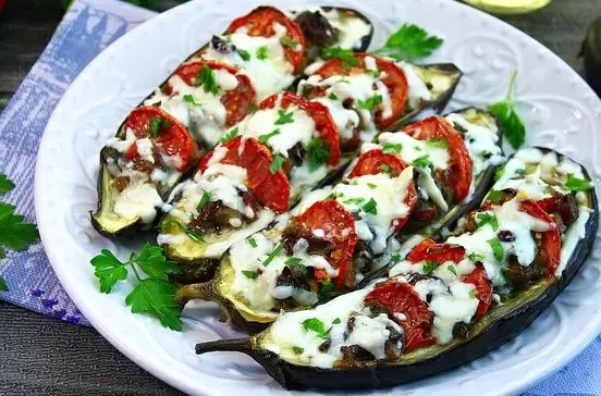 Наполните подготовленные лодочки начинкой, уложите их на противень. Оставшиеся помидоры нарежьте полукружиями и распределите по верхушкам баклажанов. Налейте 100 мл воды на дно противня и ставьте их в разогретую до 180°C духовку. Запекайте на протяжении примерно 40 минут, пока баклажаны не размягчатся, а мясо не будет готовым.