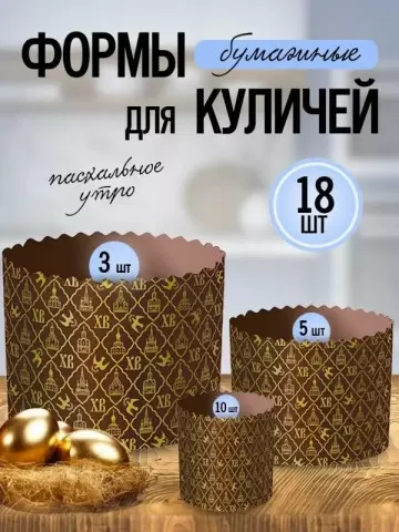 Одним из основных элементов любого кулича являются формы. Wildberries предлагает набор одноразовых бумажных форм трёх размеров: 134?100 мм (для куличей весом 500–550 г), 90?90 мм (200 г) и 70?60 мм (100 г). Выполненные из пищевой бумаги с красочным принтом, они устойчивы к жиру и выдерживают температуры от ?40 до +220°C.