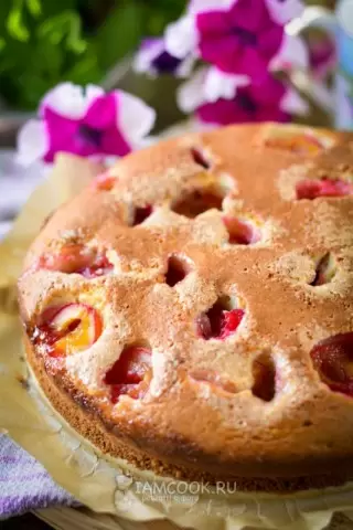 Форму для выпечки предварительно смазывают сливочным маслом или застилают пергаментной бумагой. Тесто аккуратно выливается в подготовленную форму и разравнивается ложкой. Алычу необходимо вначале промыть, вдоль разрезать пополам и удалить косточки. Половинки алычи слегка вдавливаются в тесто, срезом вверх.