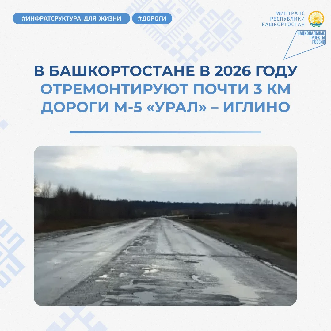 В Иглинском районе Башкортостана в 2026 году отремонтируют почти 3 км дороги М-5 «Урал» – Иглино в рамках национального проекта «Инфраструктура для жизни».