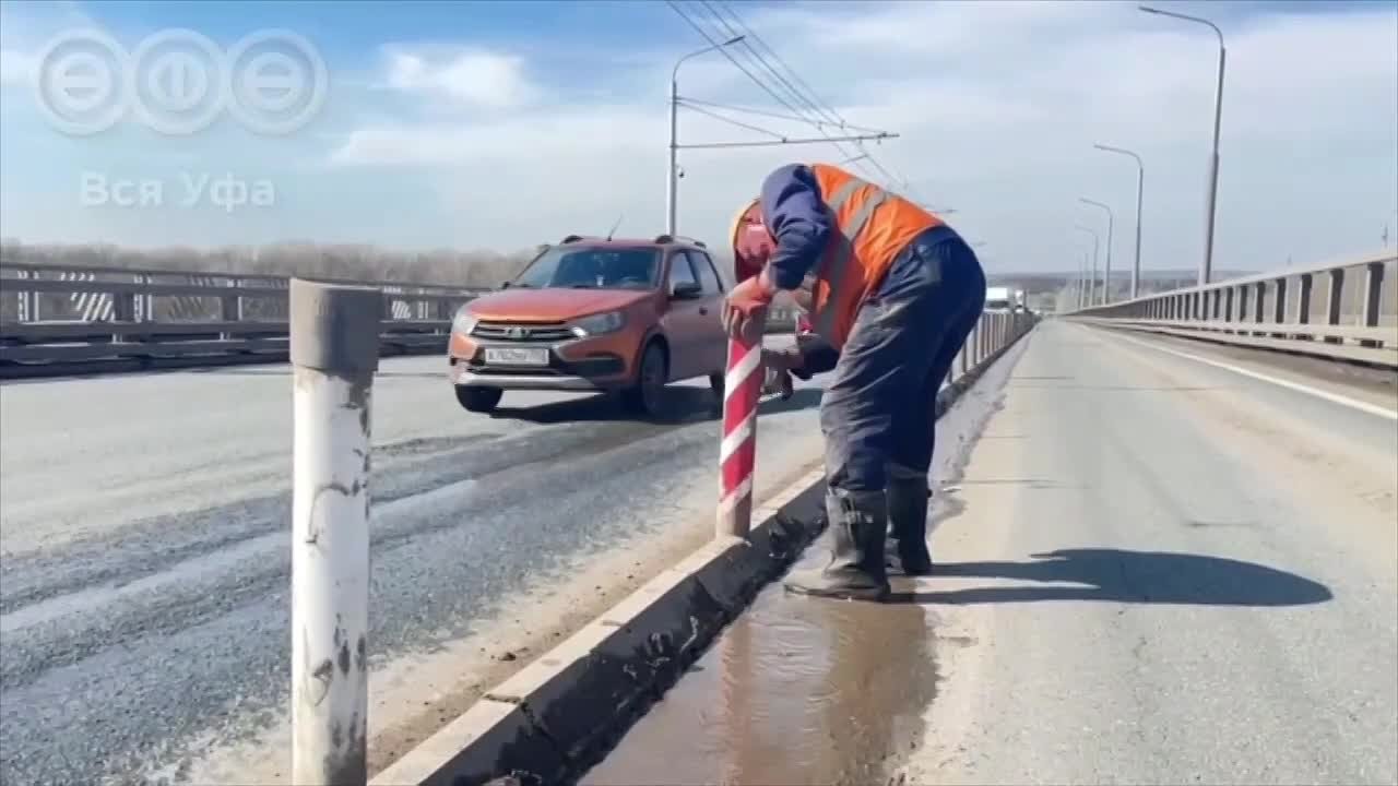 Например, на Затонском мосту работники муниципальных служб старательно вычищают от пыли и моют разделительную полосу и ограничительные столбики.