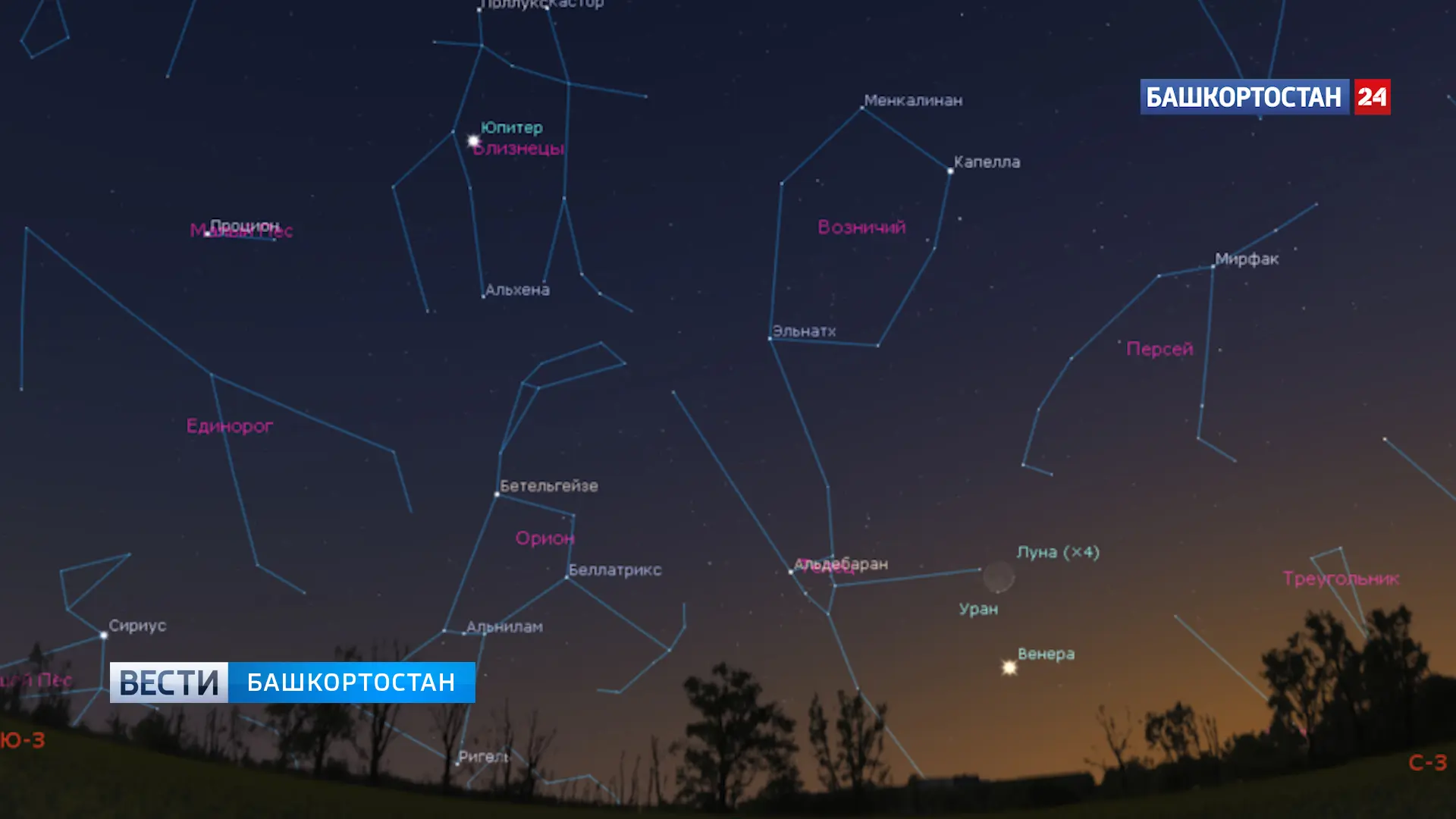 Особенность этого явления в том, что оно наблюдается всего через два дня после новолуния, когда освещено лишь 7% лунного диска. Оба светила будут находиться в созвездии Тельца. Также на западе, в созвездии Близнецов, будет заметен яркий Юпитер. Наблюдение за этим явлением продлится около 2,5 часов. Венера зайдет за горизонт в 22:57 по уфимскому времени, а Луна - примерно через 50 минут после нее.
