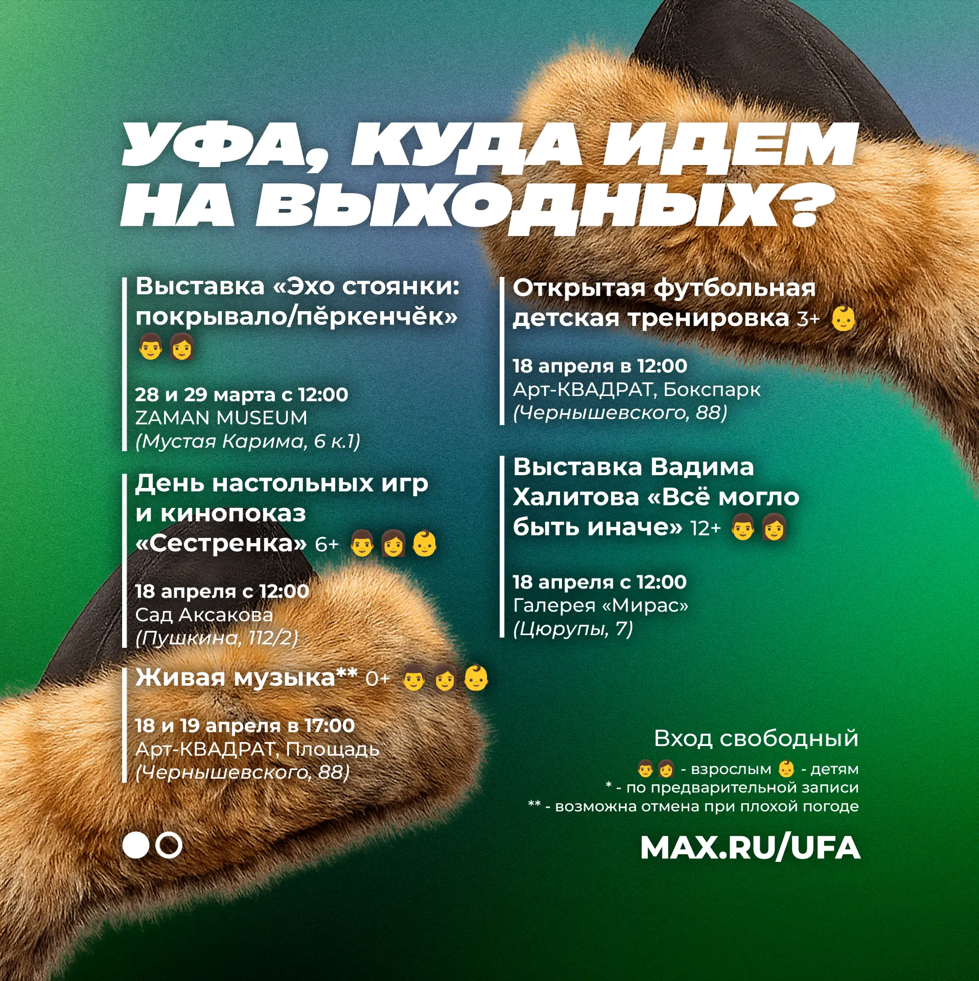 Если афиша стала для вас полезной - поставьте нам . Вам не сложно - а нам приятно и дальше собирать для вас бесплатные мероприятия на выходные