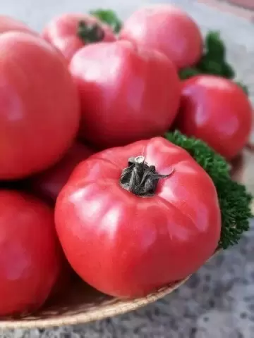 Плоды данного гибрида отличаются округлой формой, гладкой поверхностью и насыщенно-розовым цветом. Средняя масса достигает 220 граммов, и они обладают мясистой, сахаристой мякотью с высоким содержанием сухих веществ. Это делает их незаменимыми в свежем виде — в салатах и соках.