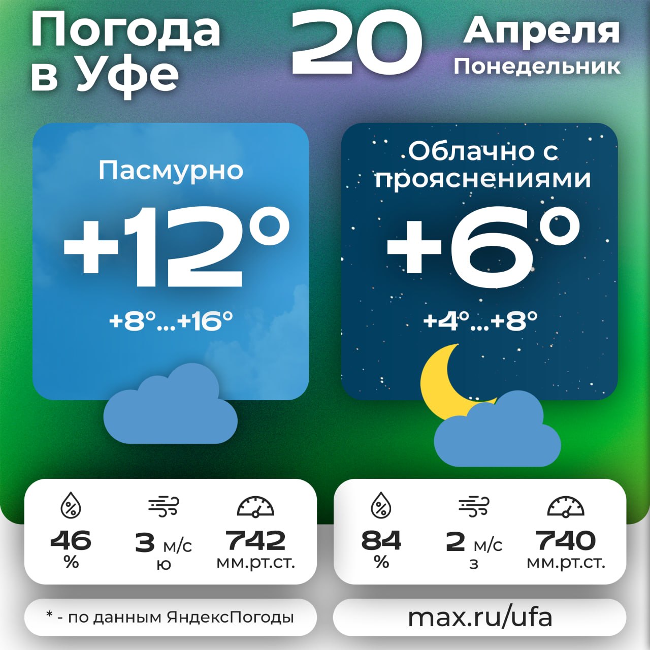 Местами небольшой дождь.Ветер юго-восточный, южный 5-10 м/с, днем местами порывы до 15 м/с.Температура воздуха ночью +3,+8°, при прояснениях до -3°, днем +12,+17°.На автодорогах ночью и утром местами дымка, видимость 1-2 км.В Уфе облачная погода с...