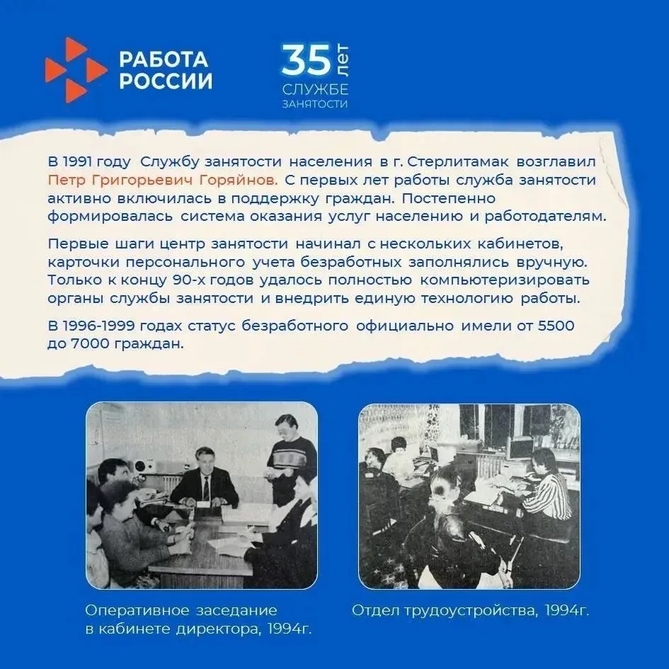 Стерлитамакская служба занятости населения прошла путь от первых центров до современной системы, которая помогает строить карьеру, находить работу и адаптироваться к переменам на рынке труда.