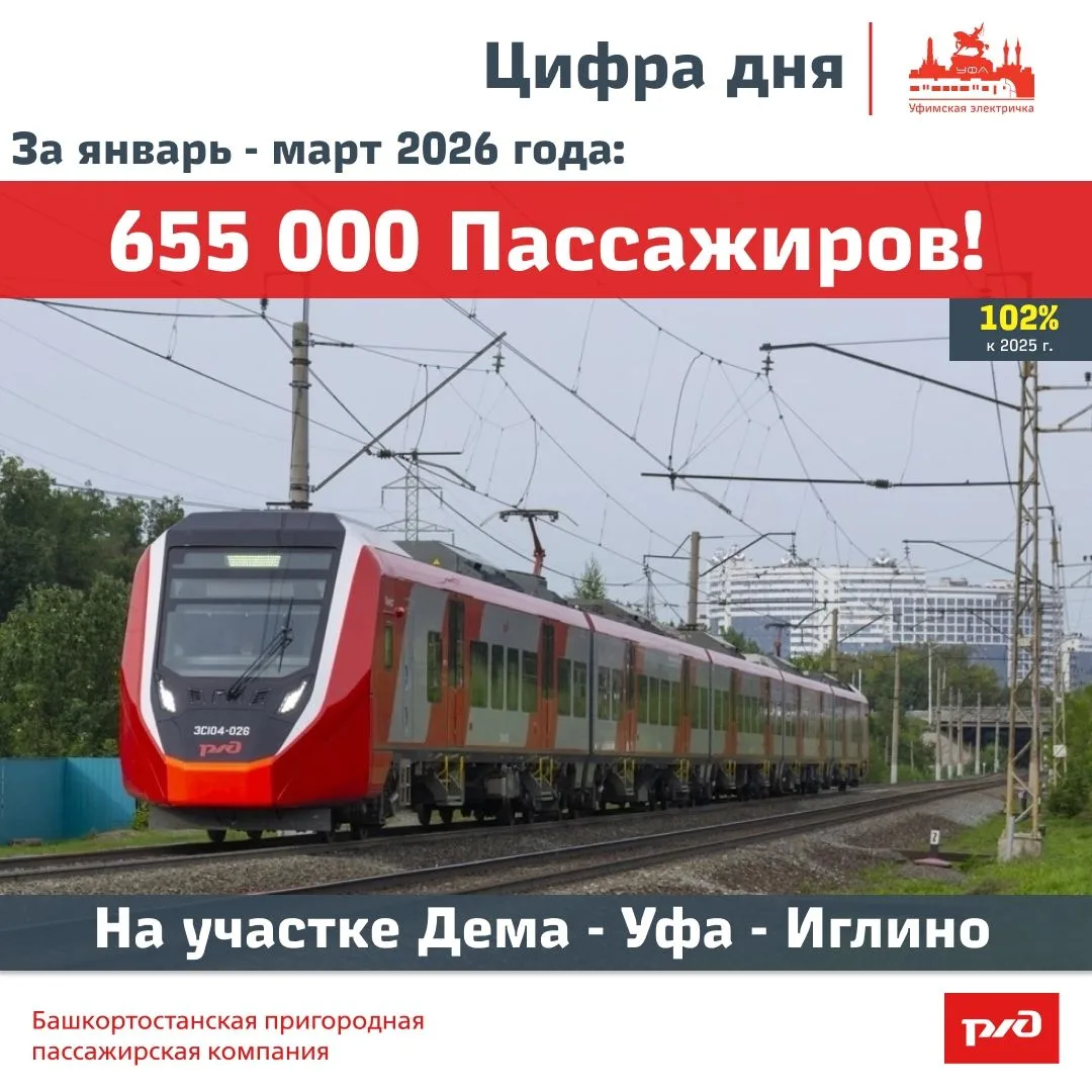 За первый квартал 2026 года пригородные поезда АО «Башкортостанская ППК» в черте «Уфимской агломерации» на участке Дема – Иглино перевезли 655 000 пассажиров. Это на 2% больше, чем за аналогичный период 2025 года.