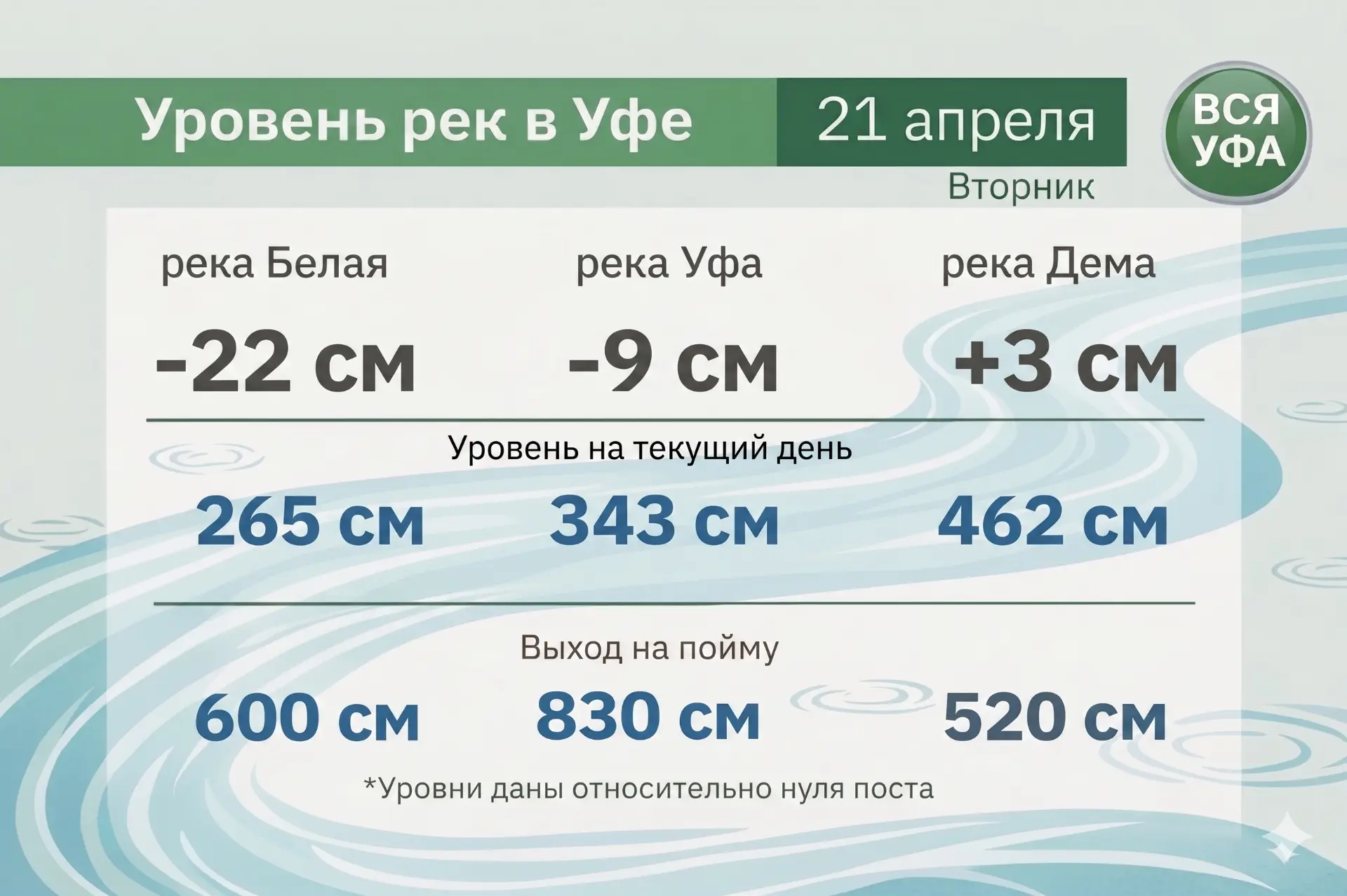 За сутки Белая снизилась на 22 см, река Уфа — на 9 см. Небольшой рост фиксируют только на Дёме — плюс 3 см.