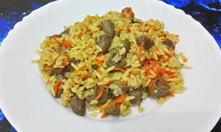 Пока сердечки и морковь готовятся, рекомендуется промыть рис. После этого его отправляют в сотейник к сердечкам, добавляют 4 стакана воды и все специи. Смесь нужно перемешать и довести до кипения. Когда вода закипит, огонь уменьшают, и сотейник накрывают крышкой, оставляя блюдо томиться на 15-20 минут, пока рис не впитает всю воду.