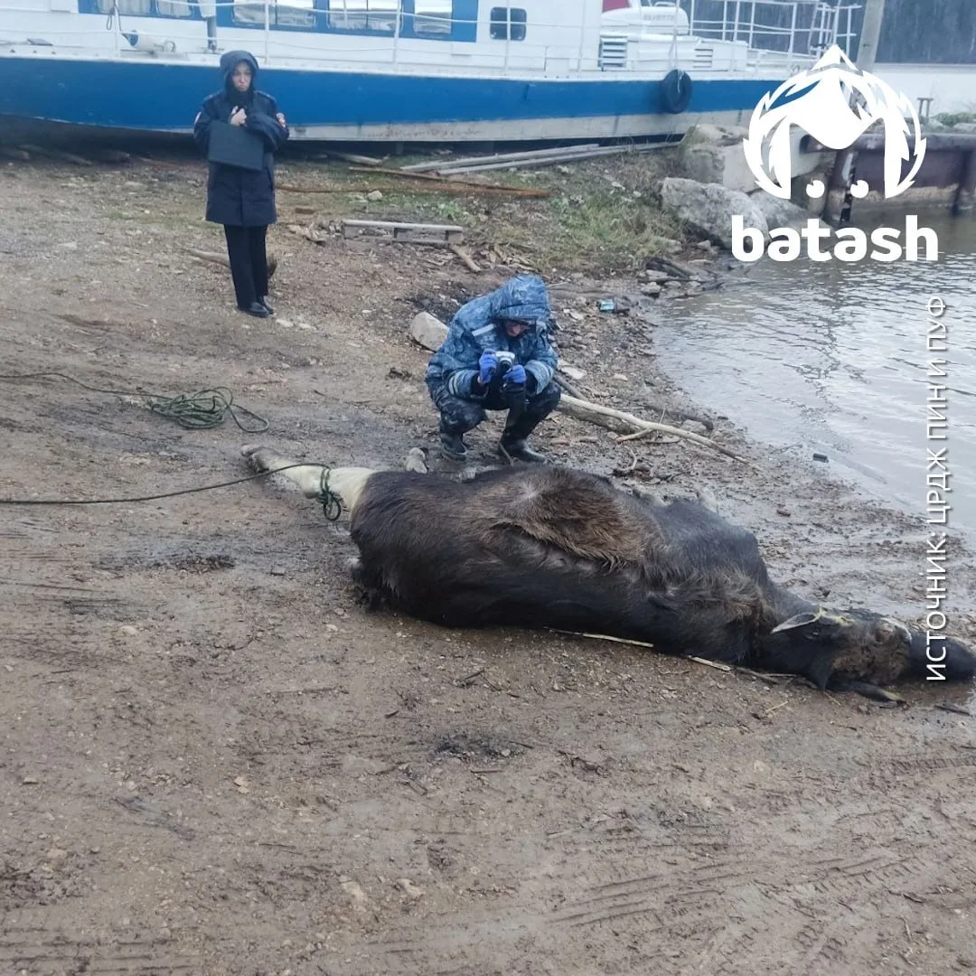 Изначально спецам Минэкологии и "Пин и Пуфа" сказали, что в воде лежит тело медведя, но на месте оказался сохатый. Тушу вытащили на берег. Предварительно, эксперты считают, что криминала тут нет.