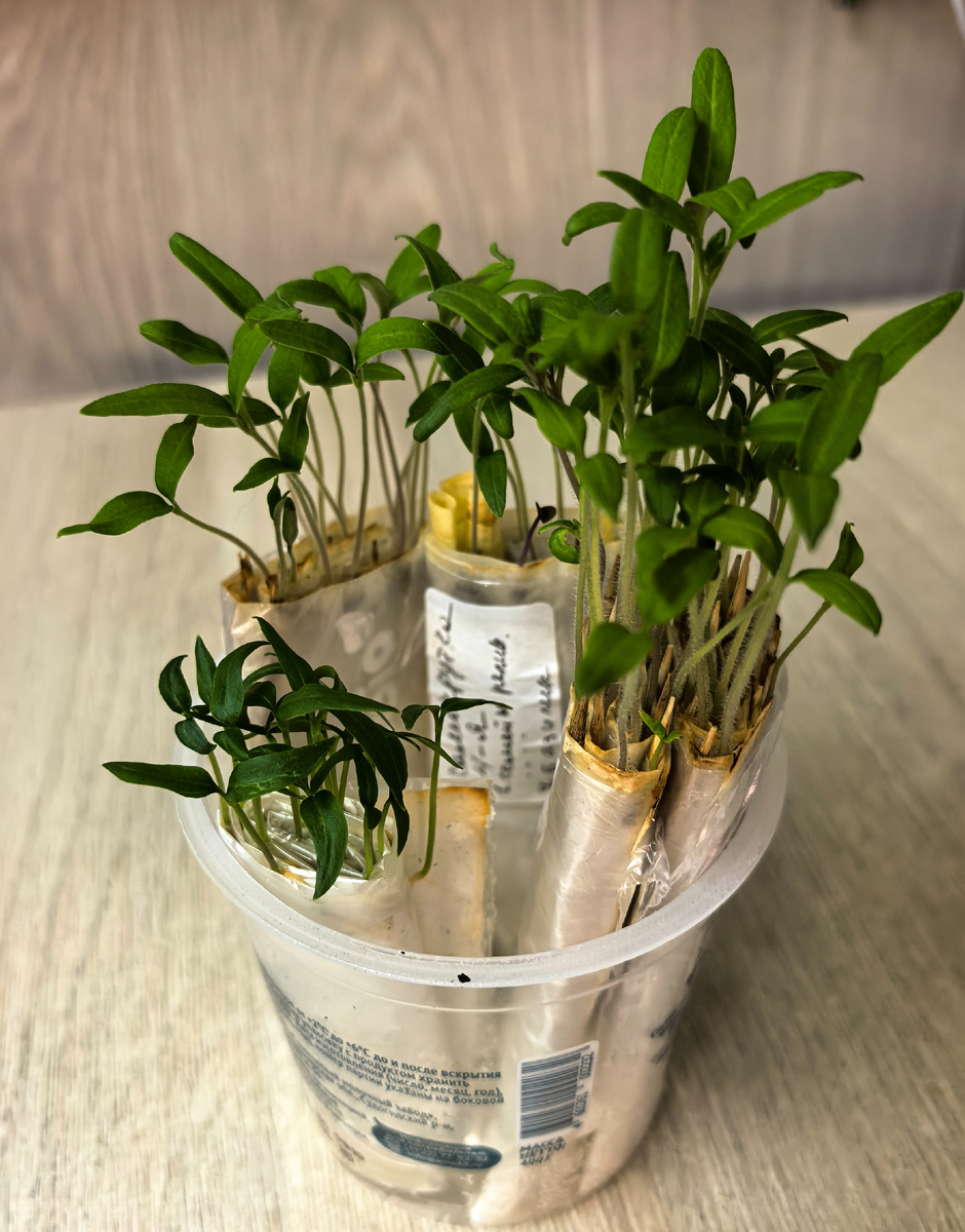 Другой вариант — самокрутка. Сложите пакет для завтрака пополам, в одну сторону положите смоченную бумагу (можно использовать туалетную бумагу), затем аккуратно разместите семена и разделите их сорта палочкой или зубочисткой. Закрутите и поместите в стакан с тем же раствором. Этот метод позволяет создать стабильные условия для прорастания семян.