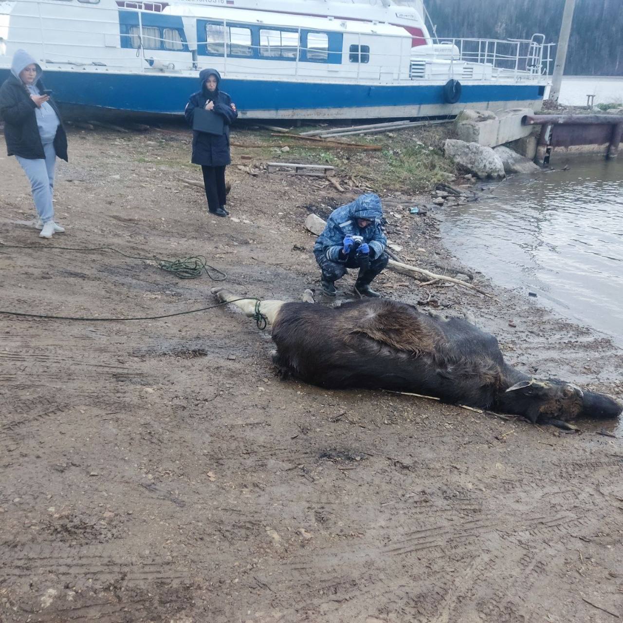 Специалистам Минэкологии и «Пин и Пуф» сначала сообщили о медведе в воде. На месте выяснили — это лось: туша почти полностью ушла под воду, поэтому её перепутали. Животное вытащили на берег.