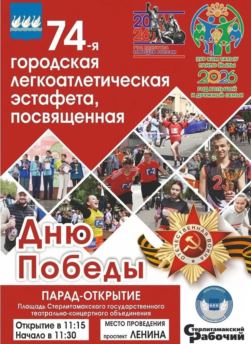 9 мая в Стерлитамаке пройдёт ежегодная 74-я городская легкоатлетическая эстафета, посвящённая Дню Победы в Великой Отечественной войне.