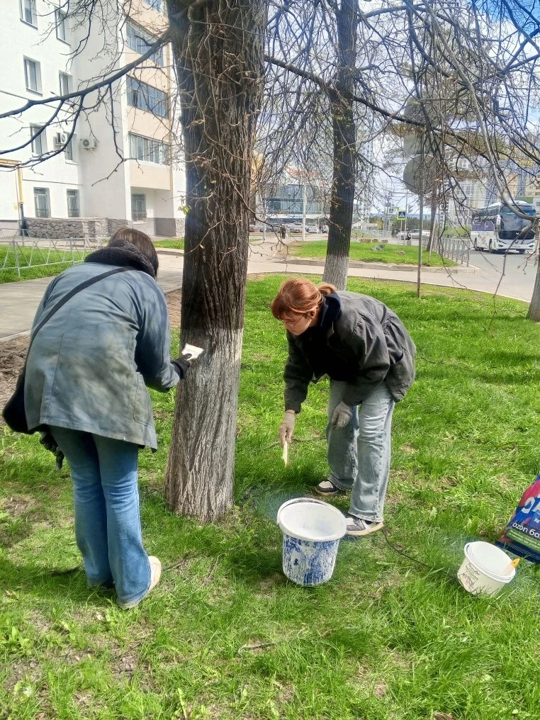 • поливают молодые деревья, удаляют сухие и повреждённые ветки, проводят защитную побелку стволов, перекапывают почву вокруг деревьев