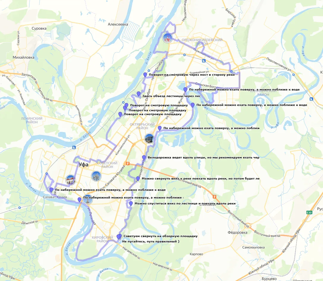 Специально разработанный для «Уфимского ожерелья» трек протяженностью около 75 км учитывает специфику езды на двухколесном транспорте: