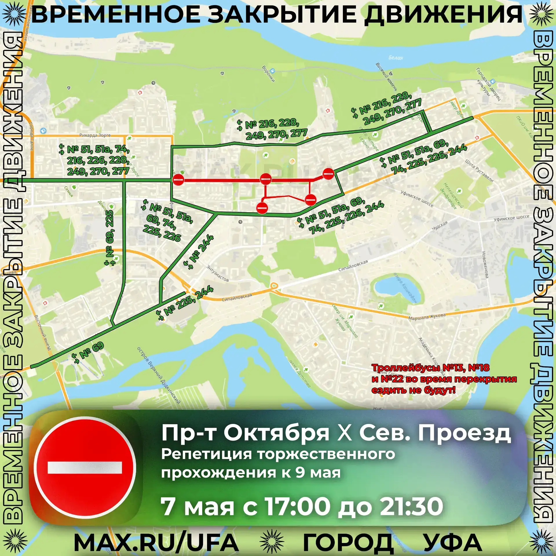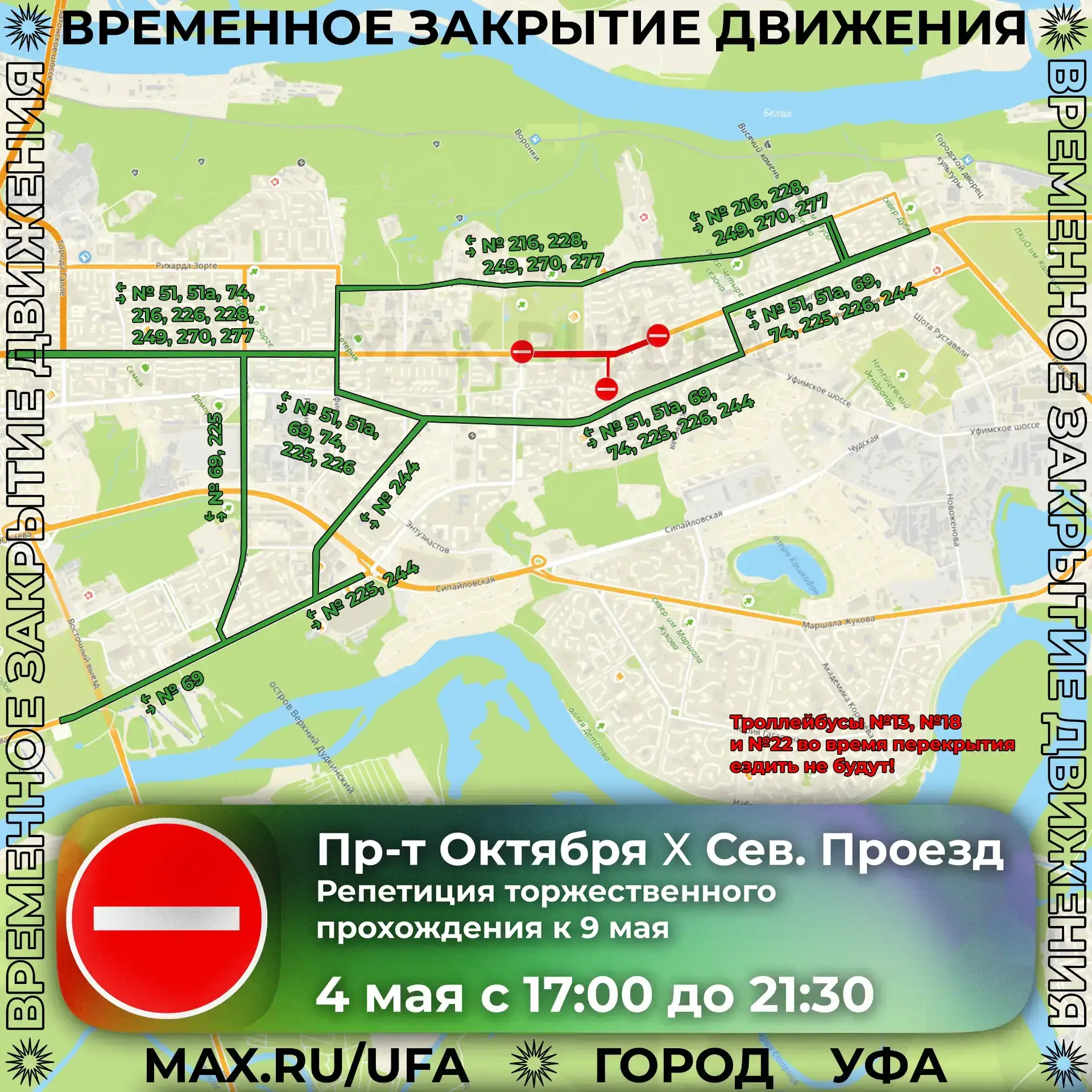 Схема движения общественного транспорта будет временно изменена. 4 и 7 мая работа троллейбусных маршрутов №№ 13, 18 и 22 на время перекрытий будет приостановлена